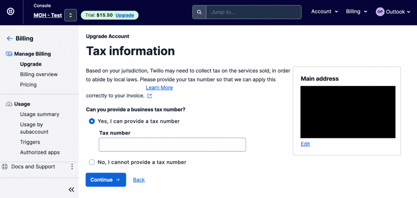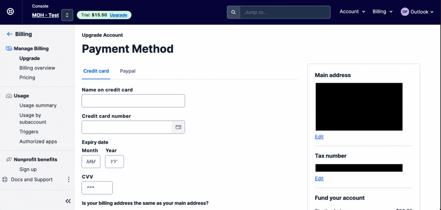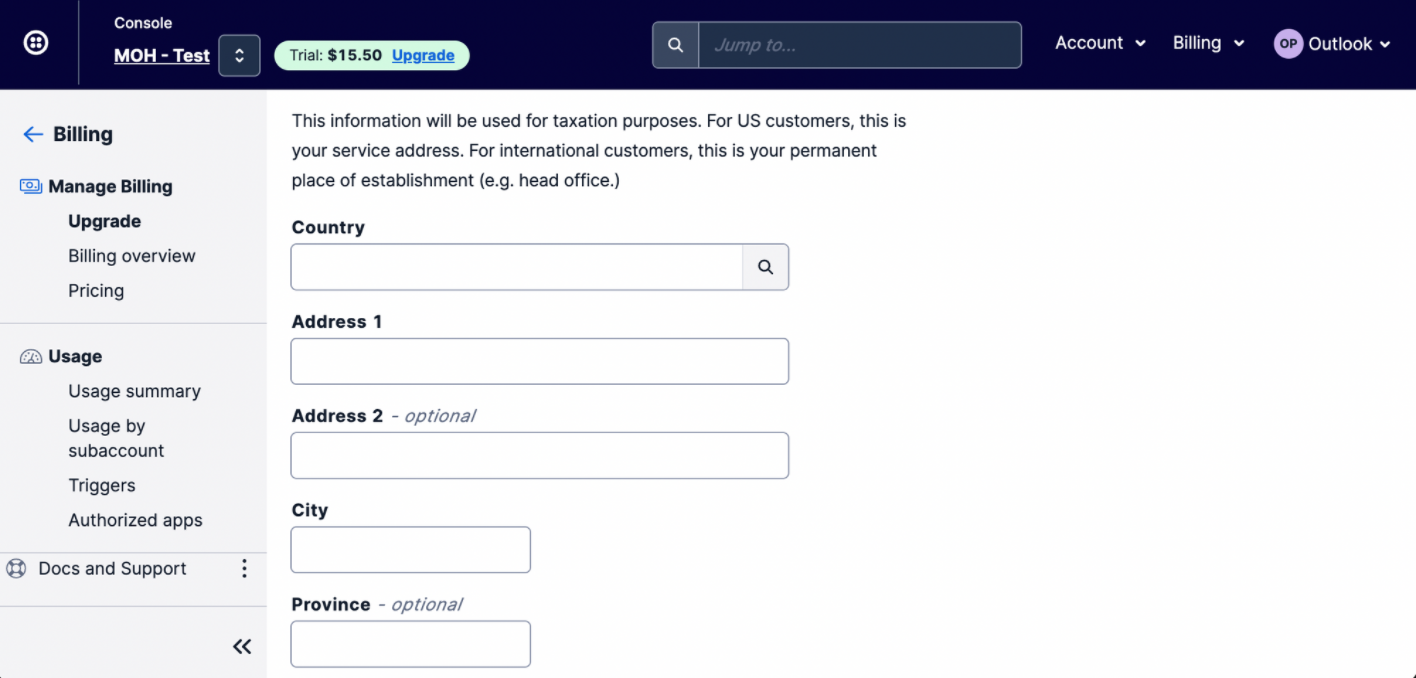 For more information about billing, refer to Twilio's document [here](https://www.twilio.com/docs/messaging/guides/how-to-use-your-free-trial-account#how-to-upgrade-your-account).
