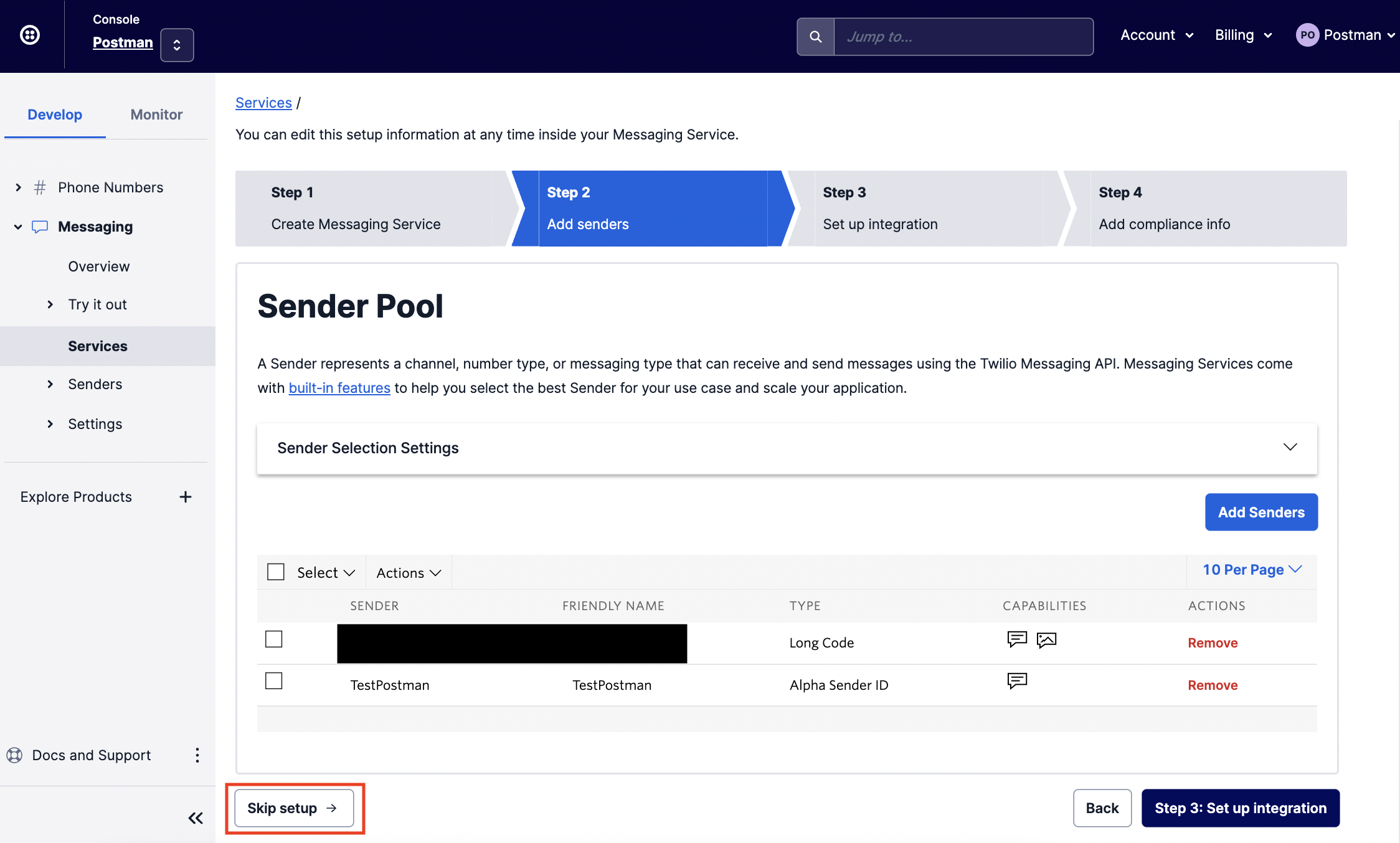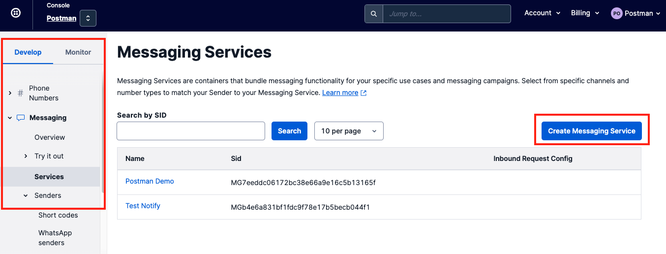 On the side bar, click `Develop > Messaging > Services > Create Messaging Service.`