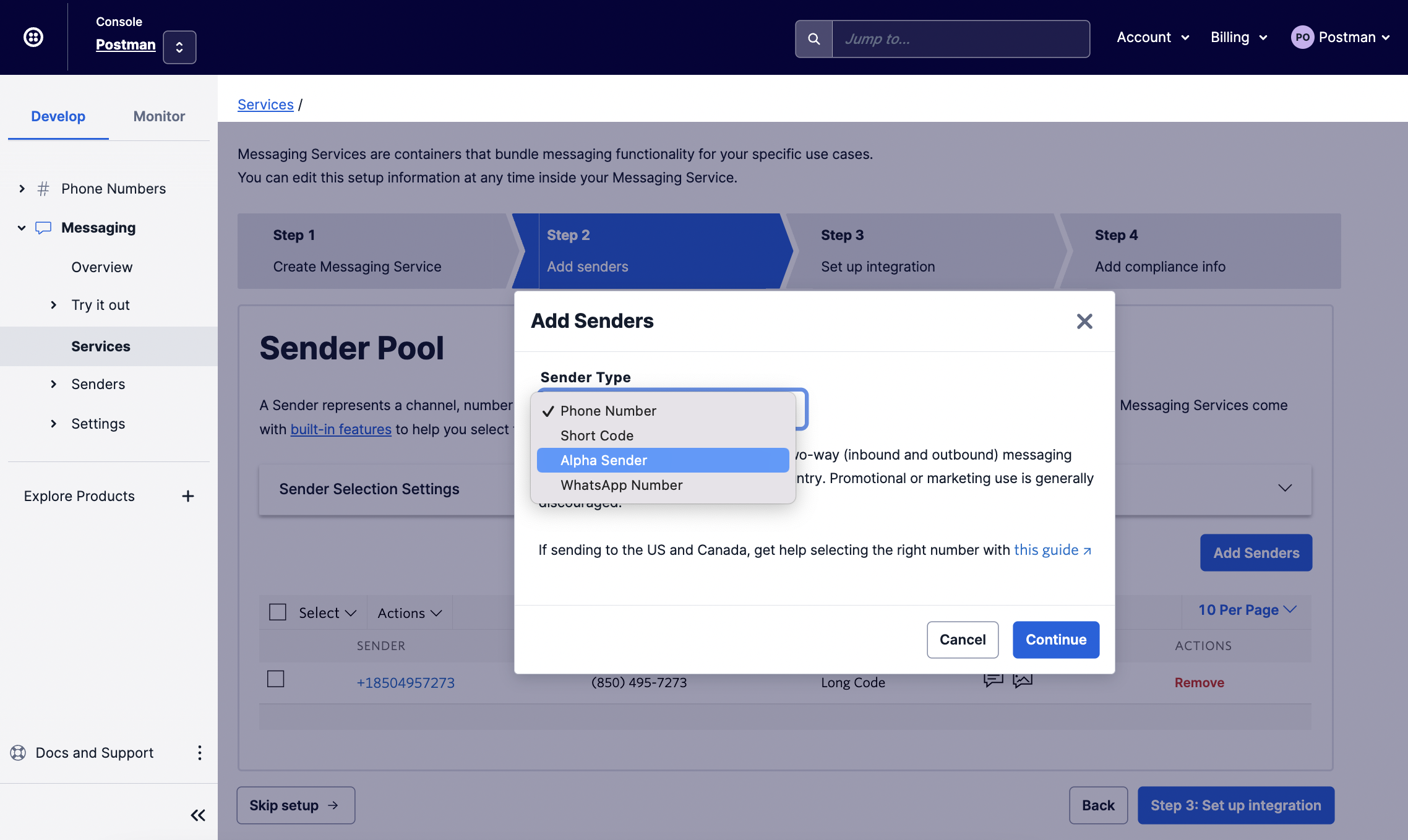 Configure your alphanumeric Sender ID by selecting `Alpha Sender` under `Add Senders > Sender Type.`