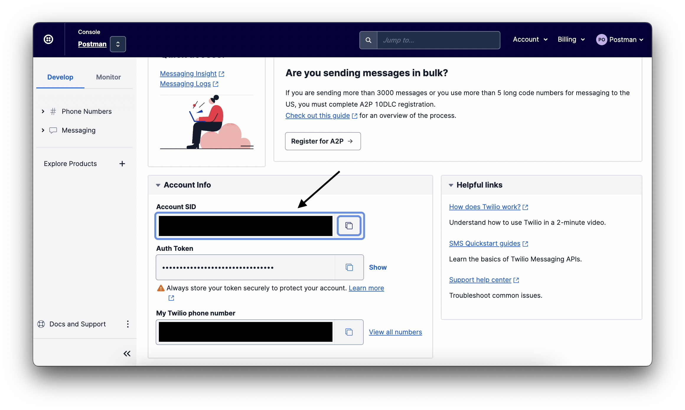 <figure><img src="https://4126954886-files.gitbook.io/~/files/v0/b/gitbook-x-prod.appspot.com/o/spaces%2F-MAQH3DF49Lq0AJudrbF%2Fuploads%2FWFQ12T2QXqr4qVQDryX4%2Fimage.png?alt=media&#x26;token=94c8bbd5-5acf-4793-8d3e-063e2491d57f" alt=""><figcaption><p>Locate your account SID</p></figcaption></figure>
