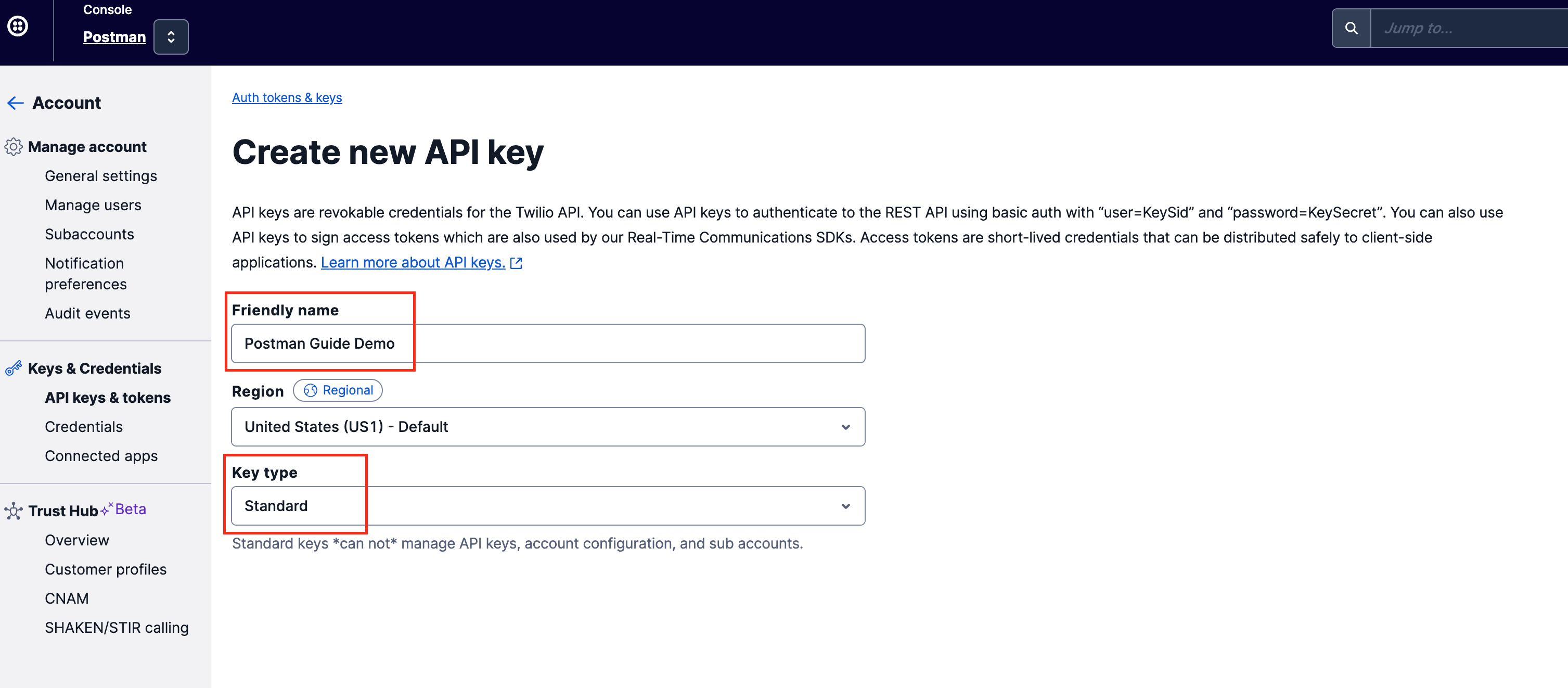 Create a `friendly name` for your API key so you can easily identify it in the future, and select `Standard` as the API key type.