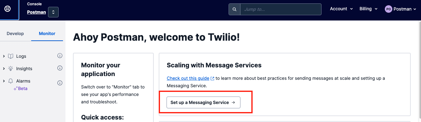 Go back to your Twilio home page, and select`Set up a Messaging Service`.