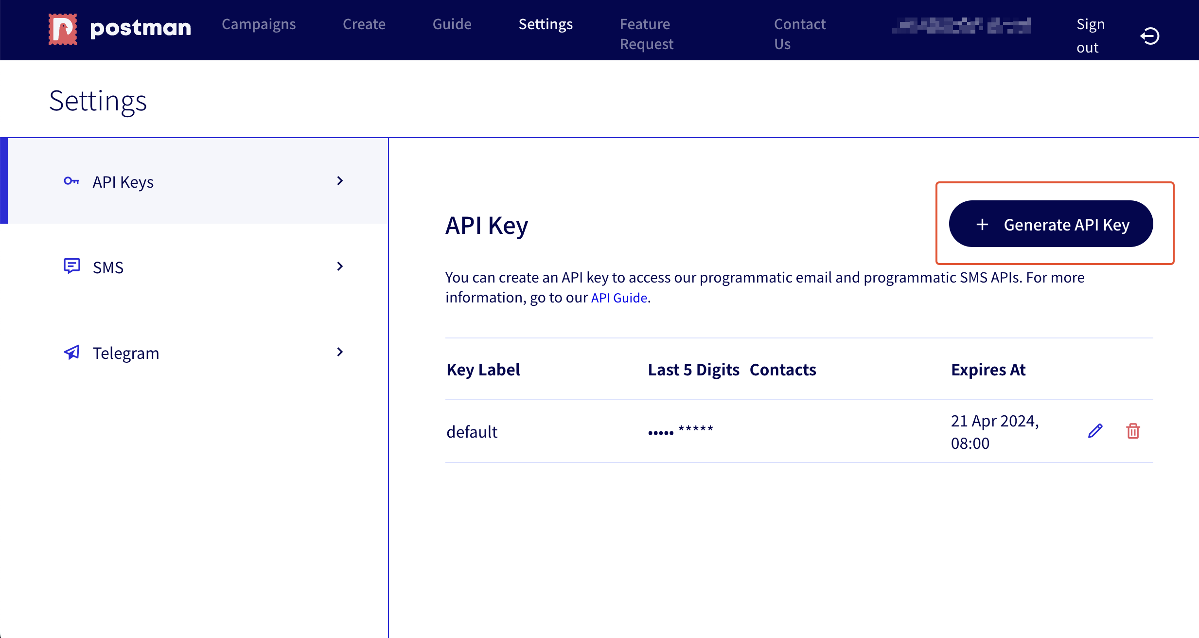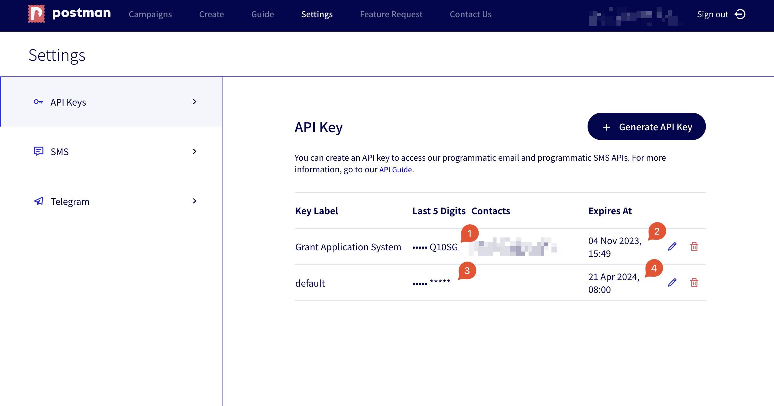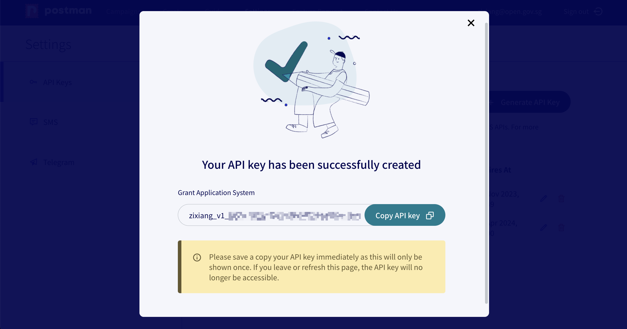 To keep your system secure, Postman's API keys automatically expire and you should rotate your Postman API key on a regular basis. We will send reminders to your the contact emails provided above when prior to expiry. For more information, [click here](https://postman-v1.guides.gov.sg/~/changes/YeLkNyuQOW0qmXU37t7T/email-api-guide/api-key-management/rotate-your-api-key).