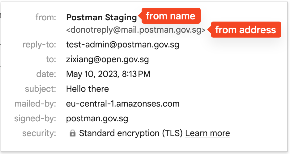 By default, all emails will be sent from Postman's email address <mark style="color:red;">`donotreply@mail.postman.gov.sg`</mark>